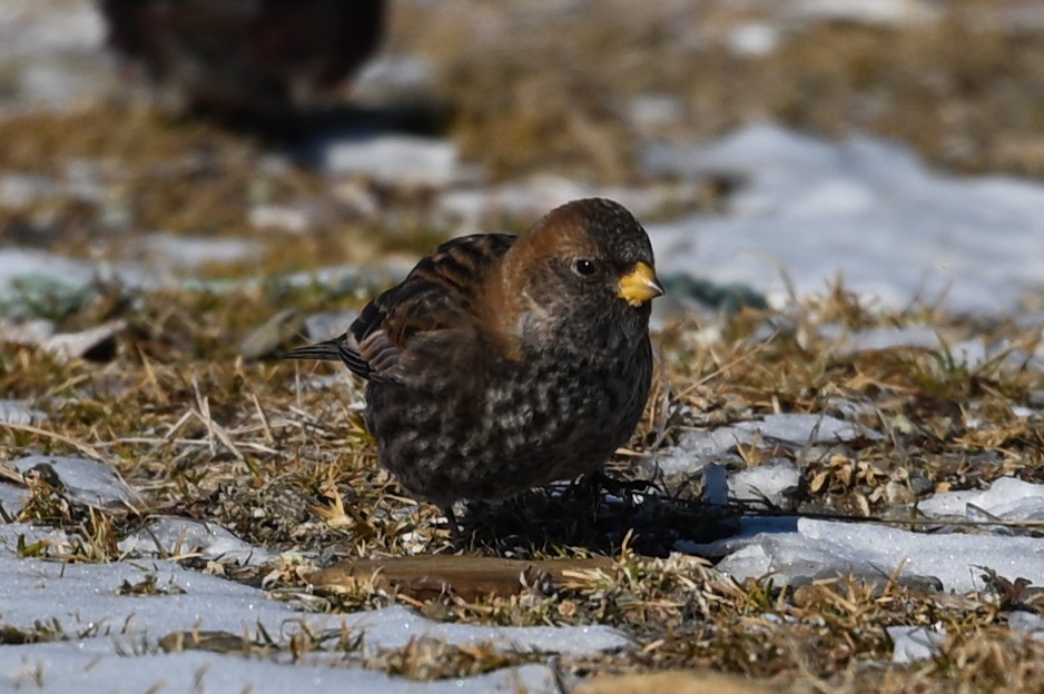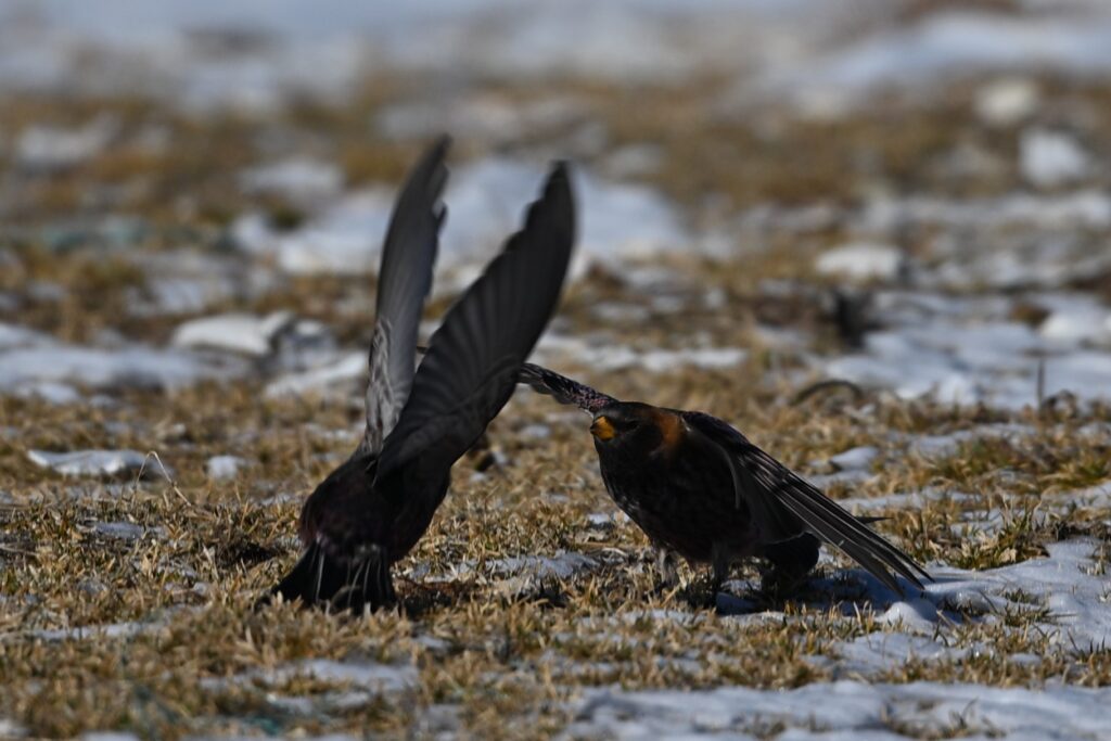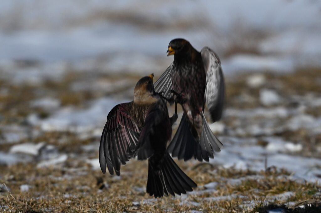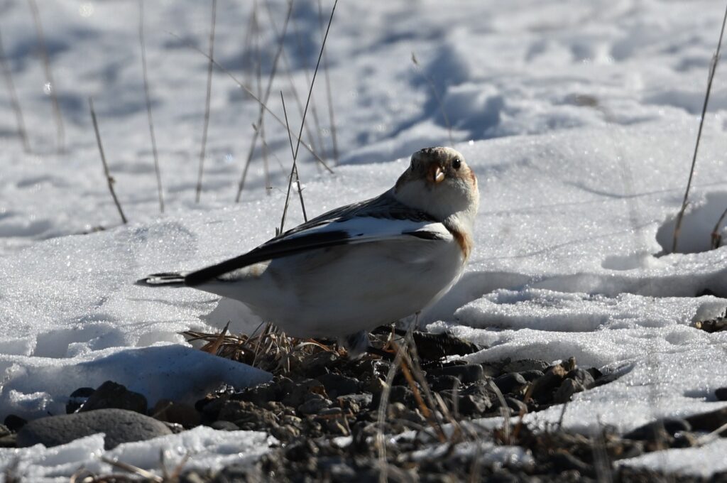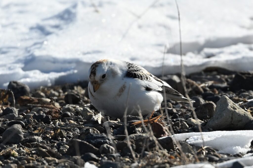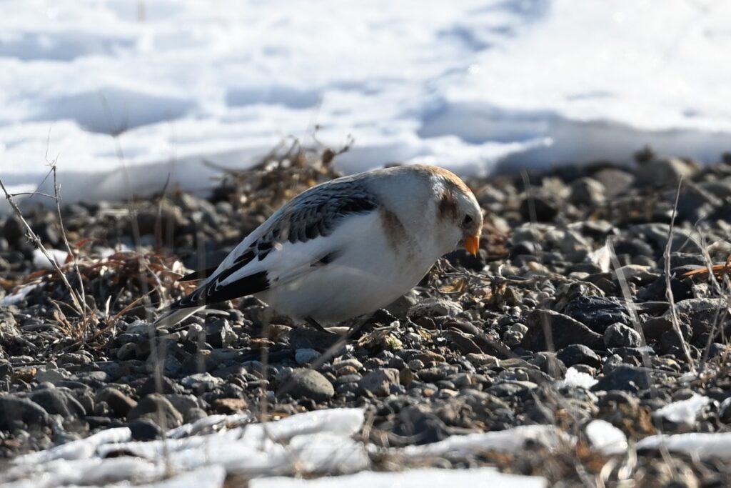 ユキホオジロを撮影していたつもりでしたが、いつの間にか色が黒っぽく変わっているのに気が付きました。逆光だったので、鳥の種類ははっきりしませんが、ユキホオジロと行動を共にすることがあるハギマシコだろうと思いました。黒っぽい鳥は2,3羽いました。しばらくすると再度ユキホオジロ(最初に撮影したツガイのオスと思われます)を発見したので、迷わずそちらを優先しました。どちらも珍重で、しかも初撮りです。ハギマシコの撮影を放棄するのはなんとも贅沢な選択ですが、私の中では主に北海道にしかいないユキホオジロの方が希少価値が高いのです。