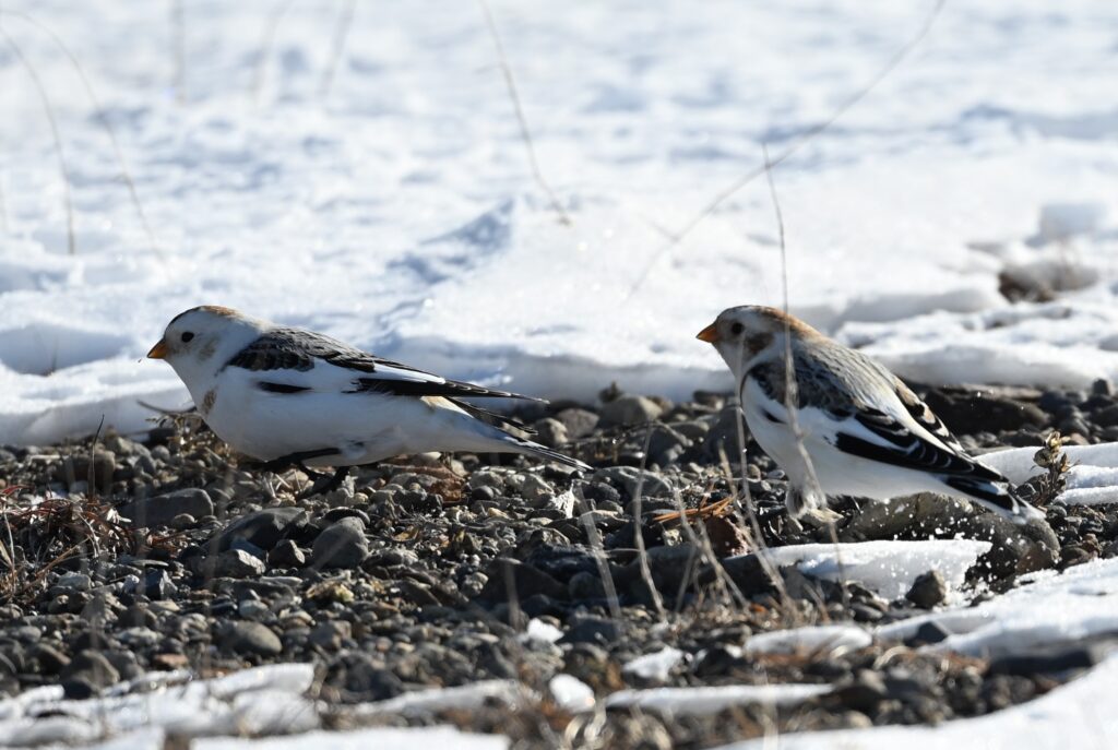 ユキホオジロは15分くらい採餌していましたが、その後飛び去ったので、私は野付半島の先端目指して歩き出しました。しかし、真冬日のうえに風がだんだん強くなってきたので、灯台から4Kmくらいのところで戻ることにしました。行き帰りの途中に3~4回、ユキホオジロと思われる白い小鳥の10羽くらいの群れが飛んでいたり遠くにいたりするのを目撃しましたが、写真は撮れませんでした。結局、上記のツガイを写しただけですが、それでも車の通行止めが吉と出て、道路沿いに来てくれたと思っています。ユキホオジロは警戒心が強めの鳥との評判です。なお、この翌日も野付半島に探鳥に行ったのですが、ほとんど野鳥を見ることはできませんでした。早朝に風が強かったのが影響していたのかもしれません。(後日追記:通行止めは2月2に解除になりました。)