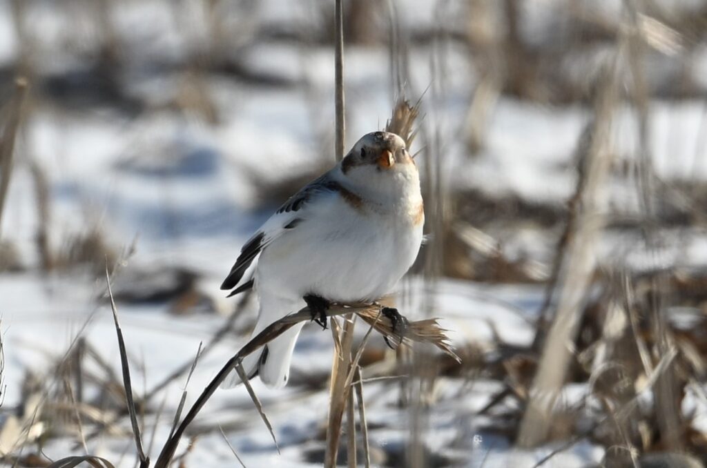 ユキホオジロは今回の探鳥で最も撮影したかった野鳥でした。野付半島は降雪のため、1月20日から灯台の手前で車は通行止めになっていました。そこから約8Km先の半島の先端付近の出現ポイントを目指して徒歩にて出発しました。途中に雪の吹き溜まりがあったので、登山靴とスパッツがあった方がいいと思います。途中までしか行けませんでしたが、恐らくチェーンスパイクやアイゼンはいらないでしょう。2Kmくらい行ったところで、急に前方から数羽の小鳥が飛んできて、通り過ぎました。白っぽかったのでユキホオジロだと思い、少し戻ってみると、あろうことかユキホオジロのツガイがわずか10mほどのところに降り立って、ハマニンニクと思われる草の種を食べ始めました。とても運がよかったです。ユキホオジロは鳴きながら飛ぶので、近づいてくるとわかりやすいです。撮影中は夢中でしたが、後で冷静になって考えると、白い小鳥のツガイがこの時期だけに最果ての雪原で採餌する様は神秘的でした。調べてみると、ユキホオジロは「浜辺の雪の妖精」と呼ばれていることがわかりました。ちなみに「雪の妖精」はシマエナガです。この2日前には群馬県でクロジ(ホオジロ科、黒っぽいです)を撮影したので、白の高潔さを鮮明に感じとることができました。ユキホオジロは時々少し飛んで、ハマニンニクと思われる植物の枝に止まっていました。写真は残念ながら全て逆光です。1枚目は左がオス、2枚目は奥がオスです。