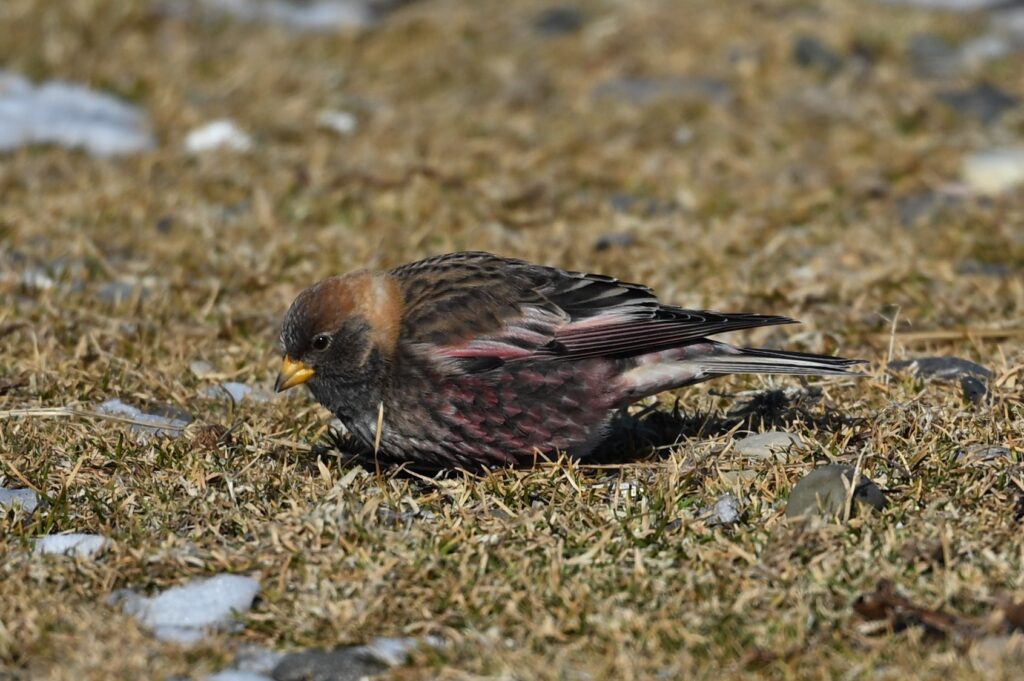 この少し後に、少し離れたところで、10羽弱くらいのハギマシコの群れを見つけました(下の写真)。一斉に地面に落ちている何か(種?)を一心不乱に突っついていました。こちらは順光でしたので、少しましな写真になっています。オス(1、2枚目はオスだと思います)の腹の赤紫色の斑点が萩の花に例えられています。地面で採餌ばかりしているので、枝に止まっている写真は撮れませんでした(ハマニンニクの種は食べないようです)ので、トレードマークをうまく写すことはできませんでした。飛翔すると全身が黒っぽく見えます(最後の写真)。ハギマシコは、今冬に筑波山や、群馬県のハギマシが出現されると言われているポイントに複数回見に行きましたが、いずれも空振りに終わっていました。