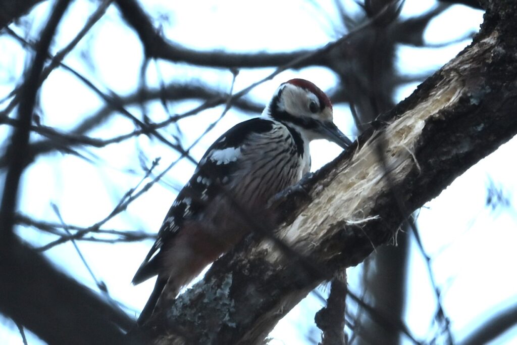 オオアカゲラ キツツキ科 森の中で探鳥しているとドラミングの音が聞こえました。それほど大きくなかったので、アカゲラだと思って写真を撮ってみると、なんとオオアカゲラ(オス)でした。真冬のオオアカゲラはパワー不足になっているのかとも思ったのですが、先週に北海道で、林に響くクマゲラのドラミング(野鳥近影Jan2026-4)を聞いていたからでしょう。クマゲラのドラミングはオオアカゲラと比べて桁違いの音量です。オオアカゲラの名誉ために検証しますと、下の写真ではドラミングの結果、枝が折れそうなほどになっているので、決してオオアカゲラのドラミングは弱いわけではありません。