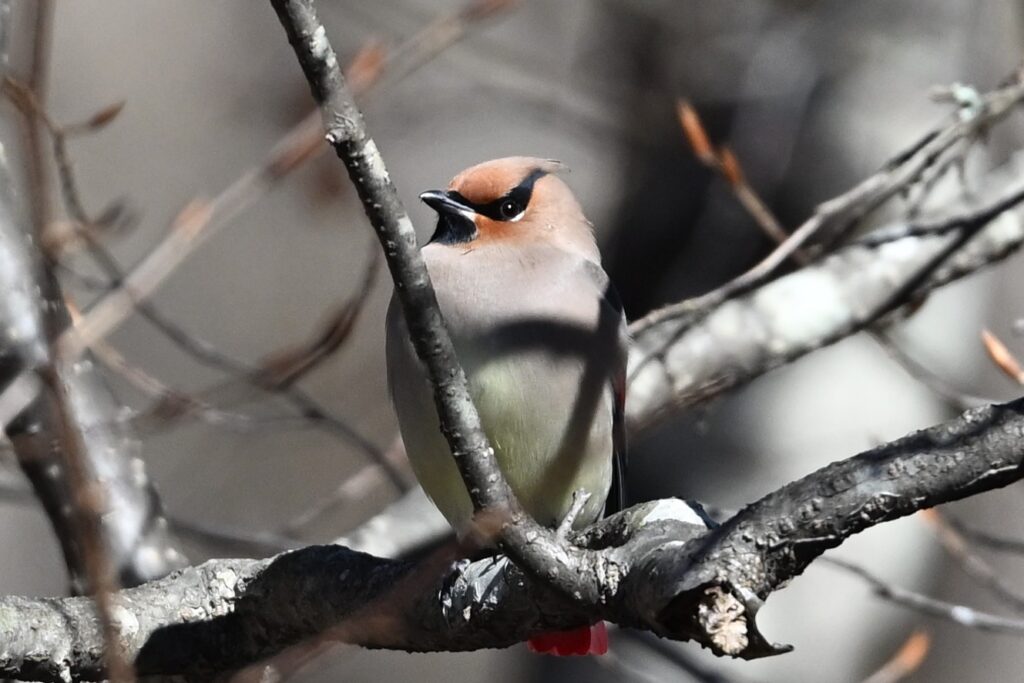 ヤドリギの実を食べていました。熟すと赤くなるのですが、この森にはヤドリギの数が多い割には赤い実が少なく、黄色の実を食べていました。常連さんによりますと、この付近に50羽くらいいるとのことですので、今冬は当たり年のようです。私は年末年始にここから少し離れたところで、キレンジャクを観察しました(最後の写真)(野鳥近影Dec2025-3)。キレンジャクは10羽もいなかったのですが、ヒレンジャクの50羽くらいの中にキレジャクは混じっていないようです。あのキレンジャクはどこへ行ったのでしょうか。