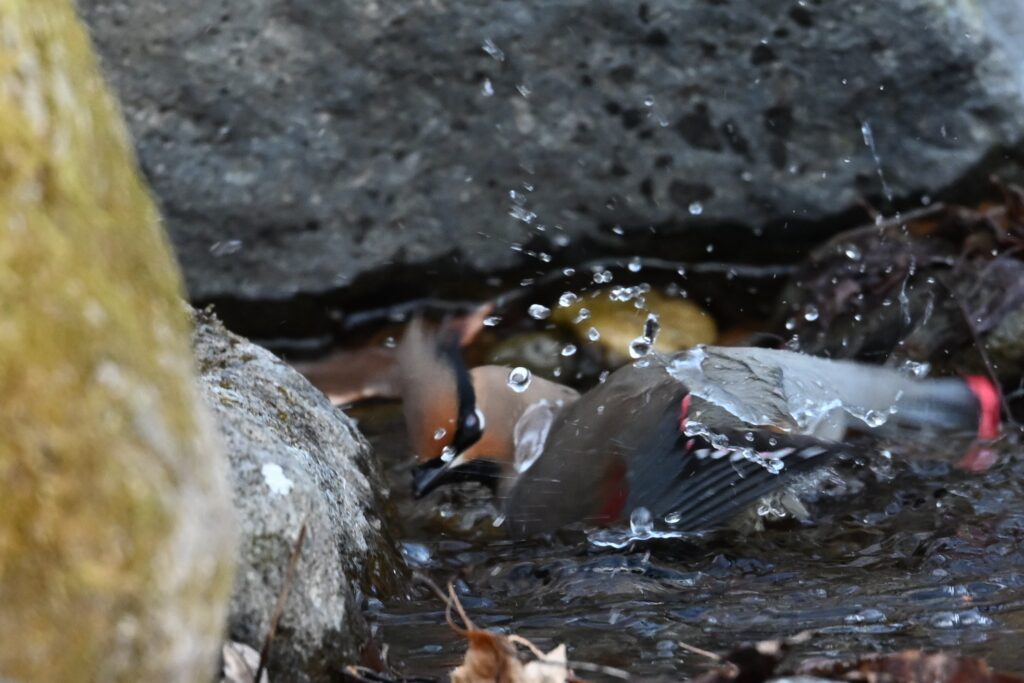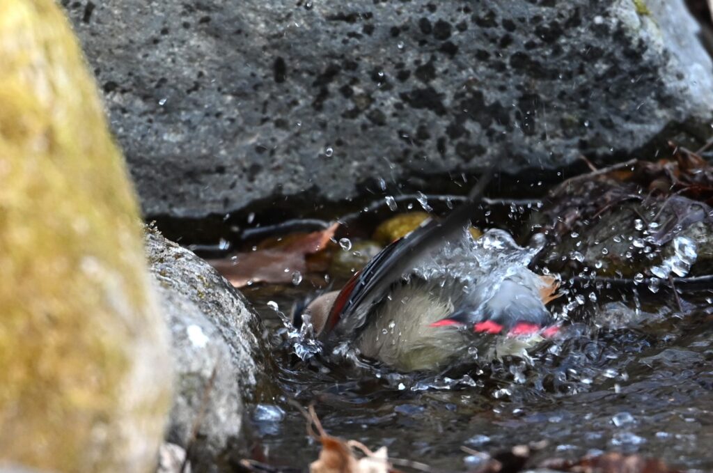 ヤドリギの実を食べていました。熟すと赤くなるのですが、この森にはヤドリギの数が多い割には赤い実が少なく、黄色の実を食べていました(2枚目)。常連さんによりますと、この付近に50羽くらいいるとのことですので、今冬は当たり年のようです。カメラマンが多いと下には降りてきてくれないのですが、たまたま私しかいない時に水浴びをしていました。私は年末年始にここから少し離れたところで、キレンジャクを観察しました(最後の写真)(野鳥近影Dec2025-3)。キレンジャクは10羽もいなかったのですが、このヒレンジャクの50羽くらいの群れの中にキレジャクは混じっていないようです。あのキレンジャクはどこへ行ったのでしょうか。