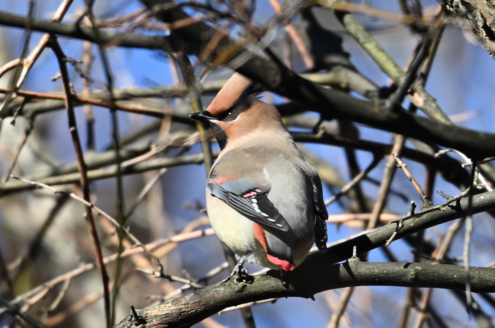 ヤドリギの実を食べていました。熟すと赤くなるのですが、この森にはヤドリギの数が多い割には赤い実が少なく、黄色の実を食べていました。常連さんによりますと、この付近に50羽くらいいるとのことですので、今冬は当たり年のようです。私は年末年始にここから少し離れたところで、キレンジャクを観察しました(最後の写真)(野鳥近影Dec2025-3)。キレンジャクは10羽もいなかったのですが、ヒレンジャクの50羽くらいの中にキレジャクは混じっていないようです。あのキレンジャクはどこへ行ったのでしょうか。