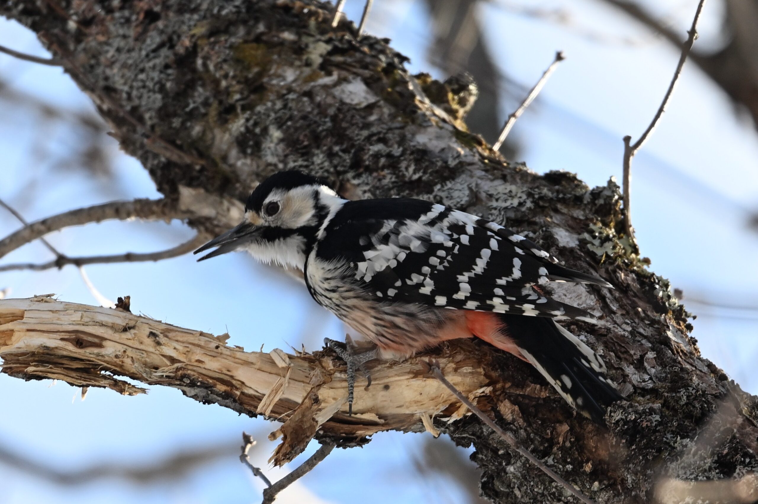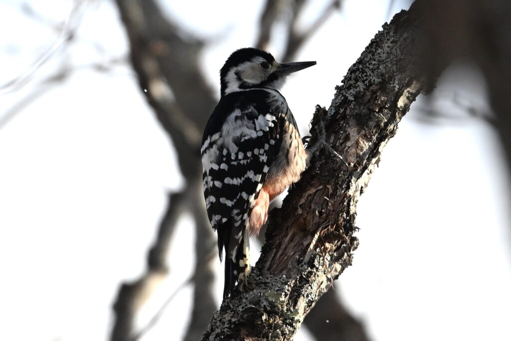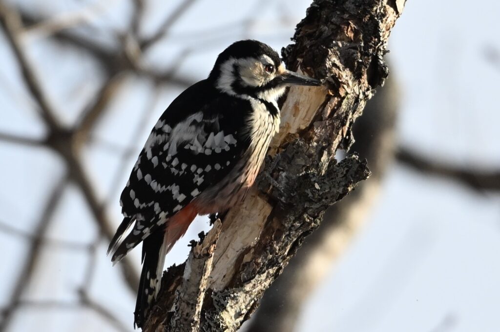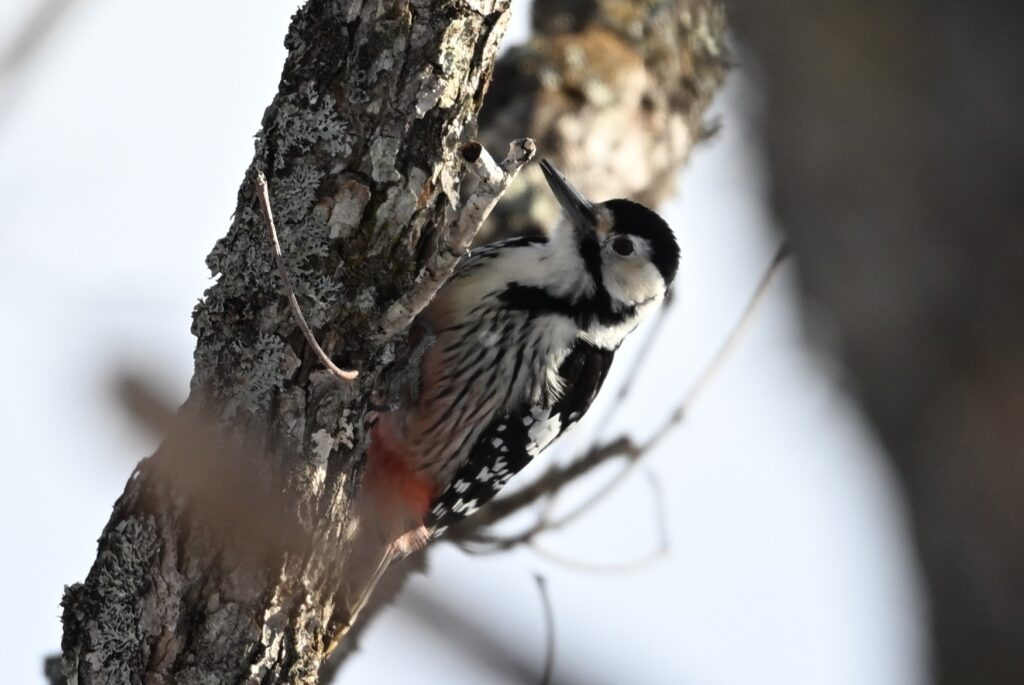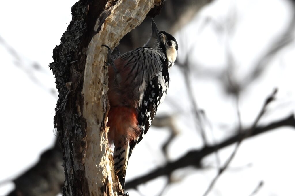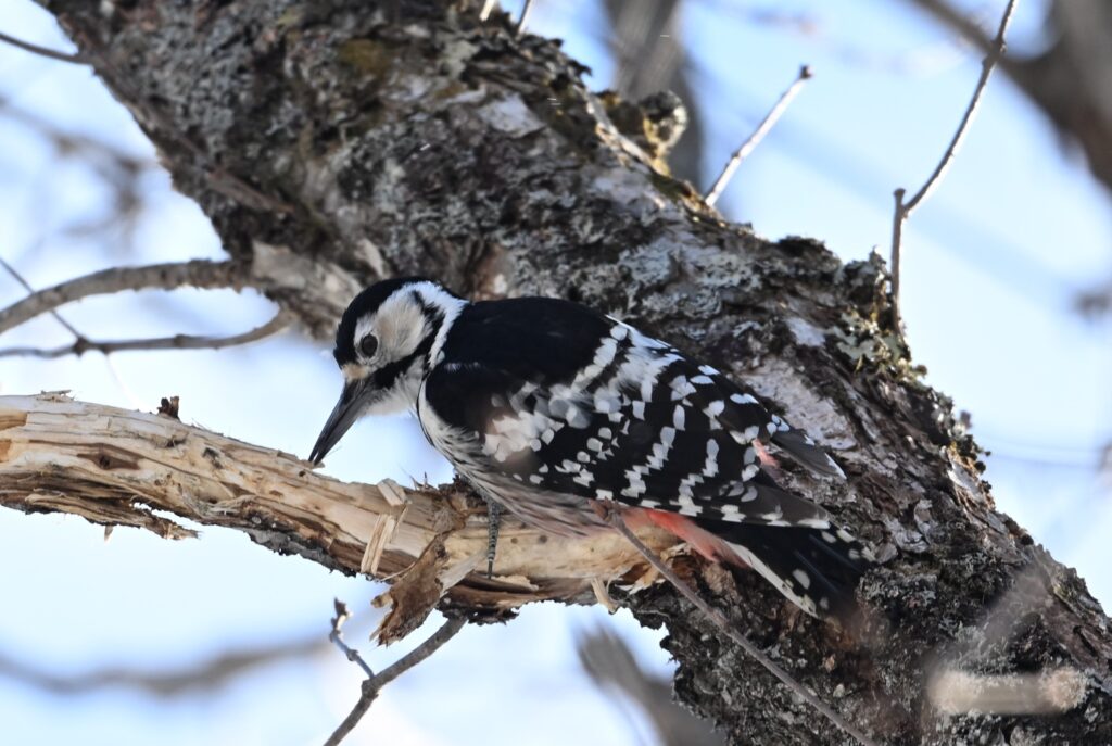 オオアカゲラ キツツキ科 この日は風が強く、川にカモ類はいましたが、森に野鳥はほとんどいません。成果なしに戻るのには未練があり、もう少しだけ探鳥してみることにしました。そんな時に1羽の野鳥が飛んできて、30mほど離れたところでドラミングを始めました。いつものアカゲラだと思って写していたのですが、背中の逆八の字の白斑がはっきりしません。脇は見えづらかったのですが、向きを変えた時に縦班が確認できました。先週(野鳥近影Feb2026-1)に続いて(先週は群馬県の赤城ふれあいの森でオスを見ました)オオアカゲラです。今回のは頭が赤くないのでメスです。時々場所を変えてドラミングしていましたが、オオアカゲラがドラミングをするところはある程度決まっているようで、1枚目と3枚目は枝が折れそうなほどえぐれています。餌となる虫は同じところにいるのでしょう。