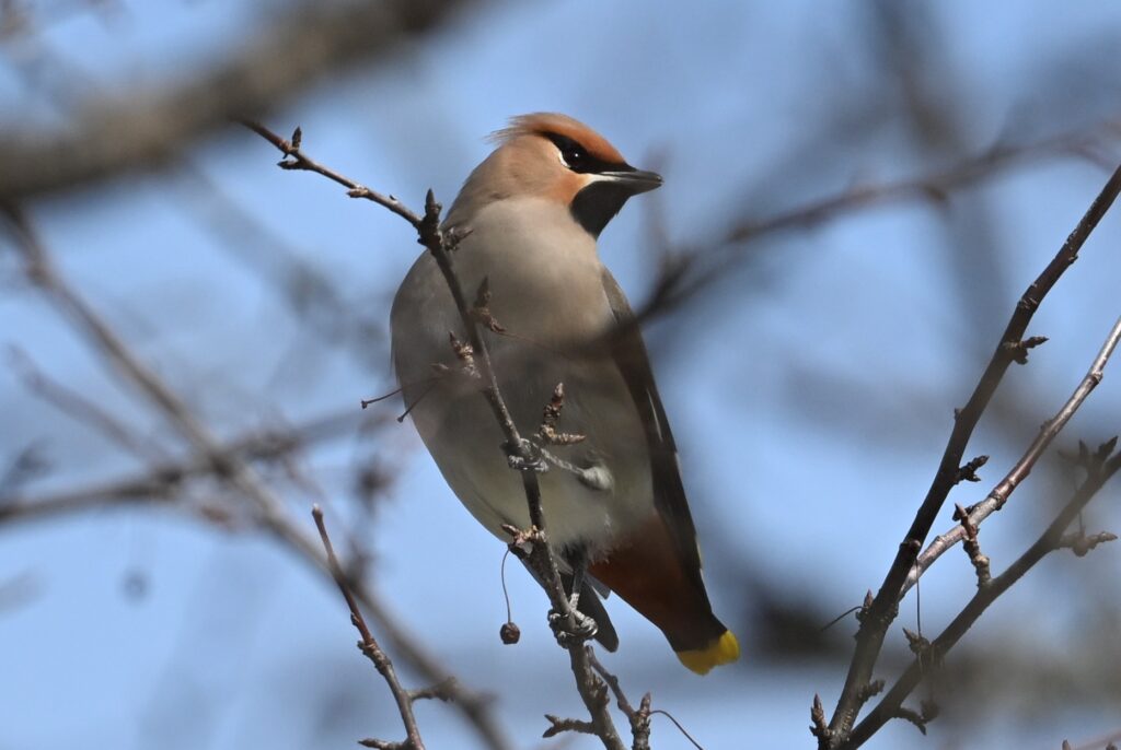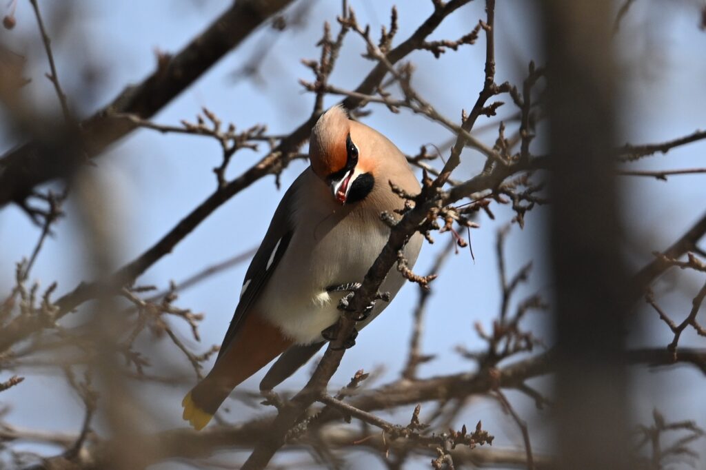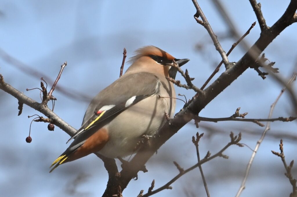 キレンジャク レンジャク科 翌日は風がなく穏やかでした。キレンジャクは目撃情報があった付近で鳴き声が聞こえたように思えたので、探してみる木の上に1羽いました。ズミの木だと思います。赤い実を食べていました。常連さんより、戦場ヶ原にはヒレンジャクはおらずキレンジャクしかいないこと、および、ヒレンジャクよりキレンジャクの方が人気があることを聞きました。恐らくですが、関東にはキレンジャクよりヒレンジャクの方が多いからキレンジャクの人気があるのでしょう。私はこの年末年初に赤城山系でキレンジャク(野鳥近影Dec2025-3)を見ましたが、最近の赤城山系ではヒレンジャクしか見られていないようです(野鳥近影Feb2026-1)。私はどちらでも大歓迎です。独特の風貌と、絹のように滑らかな感じの羽毛がいいです。