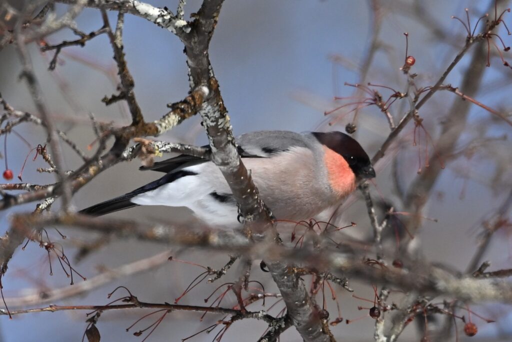 ウソ アトリ科 ウソは口笛のような鳴き声を聞いてから姿を見る場合が多いのですが、今回は鳴き声を聞かないうちに姿を見つけました。何の鳥かわからずにレンズを向けたら、本当のウソ、しかもオスでした。ウソは探鳥時に時々見かけますが、高いところにいたり暗かったりで良い写真は撮れておらず、今回は久しぶりにブログに掲載可能な写真が撮れました(前回のウソの記事:野鳥近影Nov2025-3)。この木も、前出のキレンジャクがいたのと同じズミのようです。