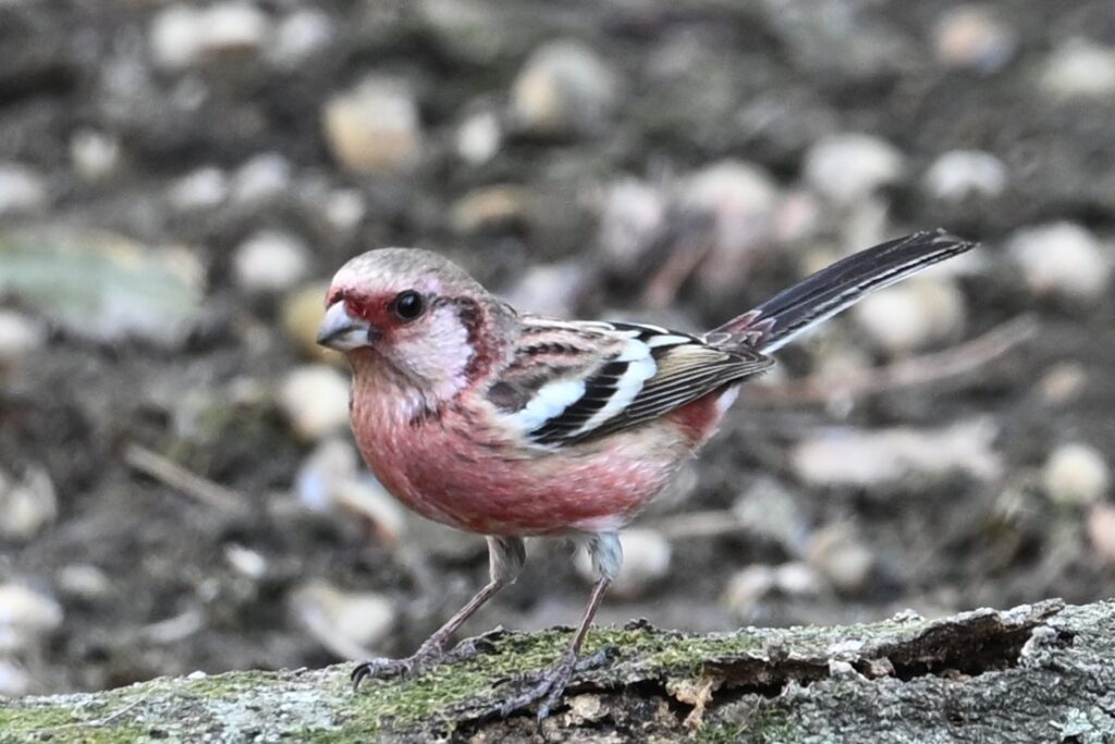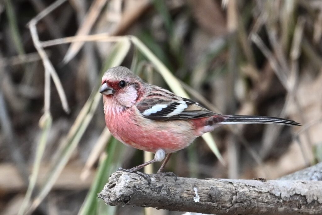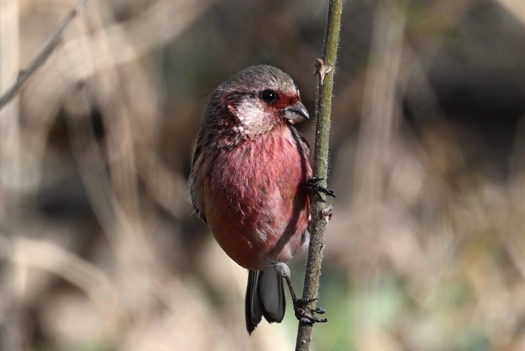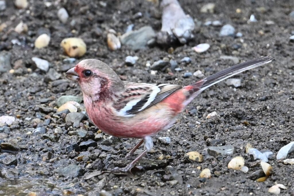 ベニマシコ アトリ科 オス 私の好きな鳥の1つです。警戒心が強く、なかなか近くには来てくれません。30mくらい離れたところに水を飲みに来ました(3枚目)。ベニマシコはオスとメスが混じった小さな群れで行動します。近くにもう一羽いたようです。